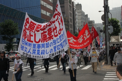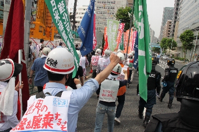 | 6月19日、全学連は、反戦青年委員会の労働者とともに、労働者・学生統一行動に決起した。世紀の核惨事である福島第一原発事故への憤激に燃えて、日本列島各地で多くの労働者・人民が「原発とめろ!」の闘いに起ちあがっている。この労働者・人民の最先頭に立って、わがたたかう労学は「すべての原発をただちに停止し廃棄せよ! 被災民見殺しの菅政権打倒!」の炎を首都中枢に燃えあがらせた。 おりしも前日の18日には、経済産業相・海江田が、定期検査によって停止している原発の再稼働を号令した。この決定的な局面において、わが労学は、「連合」古賀指導部による闘争抑圧を突き破り、日共系の「原発撤退」請願運動をのりこえ、原発・核開発反対闘争の戦闘的高揚を切りひらいたのだ。 |
