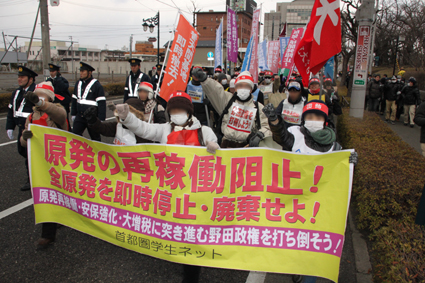 デモの出発を待つあいだ、私たちは全ての参加者に熱烈にアピールした。「原発再稼働を容認する『連合』指導部を許してはならない! 共産党系の『エネルギー政策転換』要求運動をのりこえ、今こそ原発再稼働を絶対に阻止するために闘おう!」「原発再稼働・安保強化・大増税に突きすすむ反動野田政権を私たちの実力で打倒しよう!」 アピールを聞いていた東北各地の労働者や福島の農民が「学生、がんばれ!」とこたえた。デモにおいては、「原発再稼働絶対阻止!」「全原発・核燃サイクル施設を即時停止・廃棄せよ!」「野田政権を打倒するぞ!」のシュプレヒコールを轟かせた。