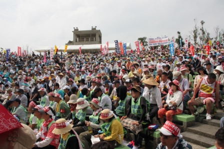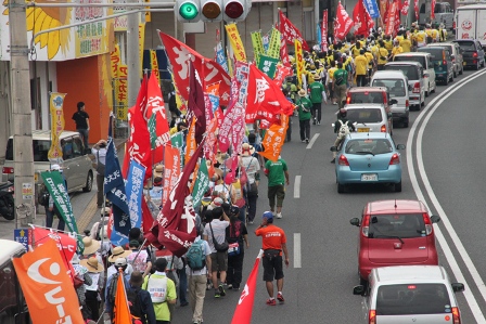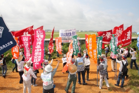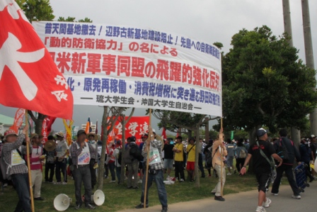 「復帰40年」を迎えた核基地の島・オキナワに「日米新軍事同盟の飛躍的強化反対!」の雄叫びか轟きわたった。沖縄県学連を先頭に、全国から結集した全学連のたたかう学生たちは、平和行進(11〜13日)、県民大会(13日)を全国から結集した労働者と固く連帯し、その最先頭で奮闘した。14日には嘉手納基地を見下ろす「安保の見える丘」に結集し、米軍嘉手納基地と沖縄防衛局にたいする怒りの全学連独自デモを打ち抜いた。さらに、5月15日には、沖縄県学連の学生が、沖縄県平和運動センター主催の「まやかしの復帰式典を糾弾する県民集会」に参加し、たたかう労働者と連帯してたたかった。「普天間基地撤去・オスプレイ配備阻止・辺野古新基地建設阻止」の反基地闘争を〈反安保〉の闘いとして高揚させるべく奮闘しぬいたのだ。