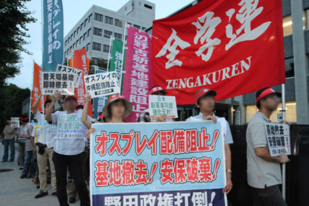 | 首都圏のたたかう学生は、7月23日、オバマ政権によるオスプレイの岩国基地への搬入強行を許さず、沖縄配備を絶対に阻止するために、アメリカ大使館にたいする抗議闘争に起ちあがった。さらにたたかう学生は、夕方6時半から市民団体主催の首相官邸前での抗議行動に参加し、「日米新軍事同盟の飛躍的強化反対!」を掲げ〈反安保〉の方向性を鮮明にさししめし奮闘した。 |