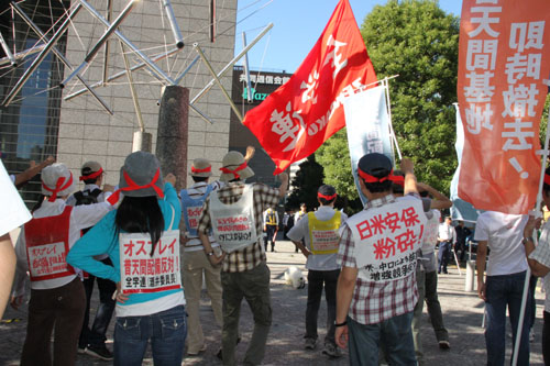 | 10月1日、東京において、首都圏のたたかう学生は、オスプレイの普天間配備を絶対に阻止するために、アメリカ大使館にたいする闘争に決起した。沖縄・普天間基地ゲートを封鎖してたたかう労働者・学生・市民と連帯し、アメリカ・オバマ政権とそれにつきしたがう野田政権にたいして、「オスプレイの配備と全国での飛行訓練を絶対に許さない」という抗議文を突きつけた。「反安保」なき反基地運動をのりこえ、〈基地撤去・安保破棄〉を掲げて奮闘した。 | ||