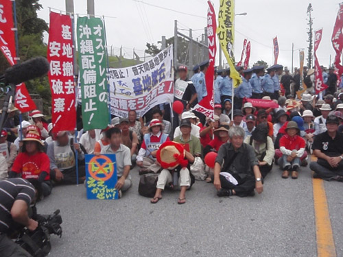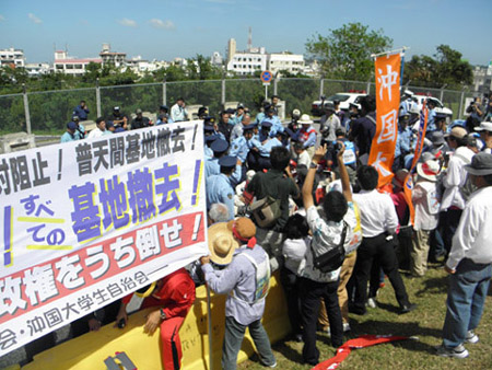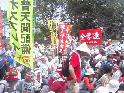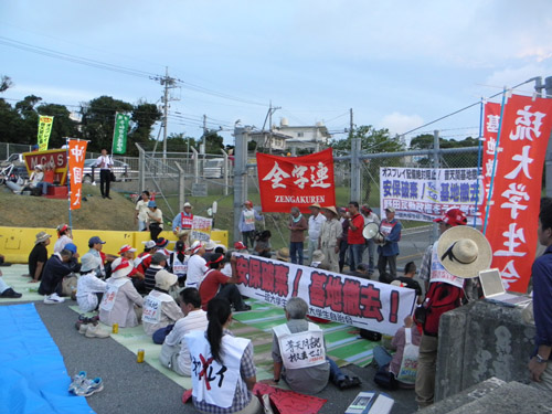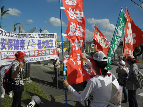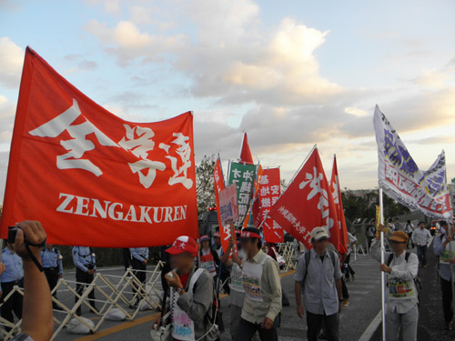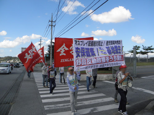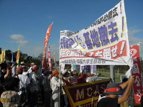 | 沖縄県学連と全学連全国派遣団の学生は、アメリカ帝国主義・オバマ政権によるMV22オスプレイの普天間基地への配備を実力で阻止するために、怒れる沖縄の労働者・人民の最先頭で、普天間基地のゲート封鎖闘争に敢然と決起した。〈基地撤去・安保破棄〉の旗を高々と掲げ、一週間にわたる激闘を最先頭で牽引した。 9月27日、われわれは沖縄平和運動センター加盟労組の組合員や市民らとともに、県警・基地警備員の暴力的弾圧をはねのけ、野嵩ゲート前の道路に座り込んだ。ついに、普天間基地・野嵩ゲート前を封鎖した。「弾圧粉砕! 配備阻止! 安保粉砕!」 学生のシュプレヒコールに全員が呼応し、その戦闘的雰囲気に気圧された県警は右往左往するばかりだった。夕方、この闘いがさらに高揚し基地突入の闘いに発展すると恐怖にかられた米軍当局は、ついに自ら野嵩ゲートを閉鎖した。労働者・学生・市民は実力でのゲート封鎖をこの日はじめてかちとった。 翌28日、午前8時半、労働者・学生・市民は大山ゲート(メインゲート)封鎖に決起した。野嵩ゲート封鎖に鼓舞された約150名の労働者・市民が、一挙にゲート前に座り込み、二車線すべてを封鎖した。米軍当局は恐れをなし、ゲート内に武装した米兵を配置した。昨日を上回る数の県警・機動隊が、いっそう凶暴なゴボウ抜きを何度も仕掛けてくる。労働者・学生・市民はスクラム固くたたかいぬき、ついに大山ゲートも封鎖に追い込んだ。この闘いに震えあがった米軍当局は『星条旗新聞』に「100名がメーンゲートを封鎖し、数十人の日本人警官と対峙したが、警察官がすぐには排除を行わなかった」と書き殴り、日本政府・警察権力を恫喝した。 29日、台風による暴風雨の中で、労働者・学生・市民は普天間基地の全ゲートを完全に封鎖した。各ゲート前に車両を置いて泊まり込み、徹夜で封鎖を死守した。労働者・学生・市民の実力決起によって、オスプレイを配備しようとしていた普天間基地をついに機能麻痺に叩き込んだのだ。30日には、米軍の意をうけた機動隊の強権的な弾圧を許さず、早朝から深夜まで、大山ゲート・野嵩ゲートの封鎖闘争を闘いぬいた。 10月1日、全学連の学生たちは早朝5時から、野嵩ゲート前での独自闘争に決起した。午前7時には9・9県民大会実行委員会主催の集会が始まり、約400名の労働者・市民が野嵩ゲートを包囲した。午前11時すぎ、オスプレイがついに飛来した。結集した全員が怒りを爆発させ、われわれのシュプレヒコールに呼応した。「オスプレイ配備をゆるさんぞ! 普天間基地撤去! 安保破棄めざしてたたかうぞ!」 県労連傘下の日共系労組員も拳をあげ「安保破棄」と呼応した。 2日、オスプレイ配備を強行したオバマ政権、そしてこれに全面協力した野田政権にたいする怒りに燃え、全学連の学生たちは、在沖米軍司令部(石平)にたいする抗議闘争に決起した。 全学連は、普天間基地の全ゲートを労働者・学生・市民が実力で封鎖するという歴史上はじめての大闘争を、終始最先頭で牽引した。ゲート封鎖の実力闘争から完全に逃亡した日共中央を弾劾し、怒れる労働者・人民の最先頭で〈安保破棄〉を掲げ奮闘した。このゲート封鎖に限りなく鼓舞され、沖縄においては、オスプレイ配備撤回の闘いが全島で燃えあがっている。 |