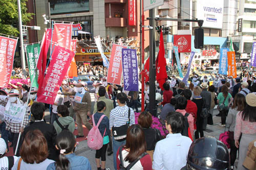 | 4月28日、安倍政権による「主権回復の日」政府式典の開催に反対し、全学連のたたかう学生は、怒りのデモに起ちあがった。安倍政権による憲法改悪、日米安保同盟の強化というネオ・ファシズム的反動攻撃を打ち砕け!――学生たちは「反安保」を放棄した日共系平和運動をのりこえて、渋谷・原宿市街を席巻するを戦闘的デモを貫徹したのだ。 |