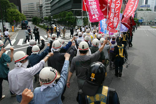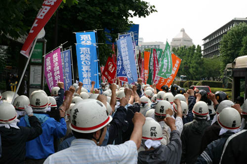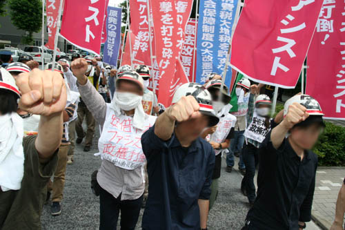 | 「安倍ネオ・ファシスト政権を打倒するぞ!」――6月30日、労働者・学生のデモ隊の嵐のような怒号が、首相官邸を揺るがした。〈軍国日本〉再興のための憲法改悪阻止! 日米新軍事同盟強化反対! 原発・核開発阻止! アベノミクス粉砕! すべての闘いの炎を集結し、安倍政権を打ち倒す闘いのときの声を上げたのだ。北海道、関西、沖縄の地で闘う労学と連帯し、全学連と反戦青年委員会の学生・労働者は、首都中枢を戦闘的デモンストレーションで席巻したのだ。 | ||