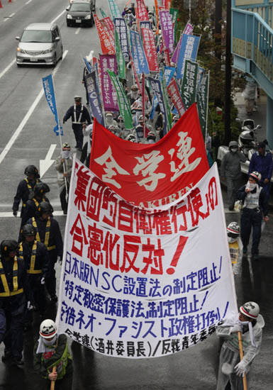 ■憲法改悪阻止! ■原発再稼働反対! ■消費税大増税阻止! 10・20労働者・学生統一行動に起ちあがろう! 安倍ネオ・ファシスト政権を打倒しよう! すべてのみなさん! 私たちは、安倍政権がふりおろす集団的自衛権行使の合憲化をはじめとする日本を「戦争をやれる国」に飛躍させるための一大攻撃を阻止するたたかいにいま起ちあがろう! 米日両権力者は、10月3日の日米安保協議委員会において「より力強い日米同盟とより大きな責任の共有」のための「日本の役割拡大」をうたいあげた。没落アメリカのオバマ政権と安倍政権は日米ガイドライン(防衛協力指針)を2014年中に策定することを決定した。それは日本の集団的自衛権行使を前提とした対中国侵略戦争計画にほかならない。日米合意にもとづいて安倍政権は、国家安全保障会議設立法案、秘密保護法案を臨時国会で成立させるために特別委員会の設置を号令した。まさに安倍政権は、日本を米国とともに「戦争をやれる国」に飛躍させるとともに、それにふさわしい国内の強権的=軍事的支配体制を強化しようとしているのだ。この日米安保の強化と日本の軍事強国化の一大攻撃を労働者・学生の反対運動の力で打ち砕け! 新ガイドライン策定反対! 集団的自衛権行使の合憲化阻止! 国家安全保障会議の設立反対! 秘密保護法制定阻止! 「反安保」を放棄する日共系平和運動をのりこえ、安倍ネオ・ファシスト政権の総攻撃を打ち砕くために、すべての学生は10・20労働者・学生統一行動に起ちあがれ! 日米安保同盟の強化反対! 集団的自衛権行使合憲化阻止! 10月3日の日米安保協議委員会(「2プラス2」)において、日米安保同盟の飛躍的な強化が画された。 ロシア・プーチン政権の猛反対に直面してのシリア軍事攻撃の断念、「オバマケア」をめぐる与野党対立の収拾不能ゆえの国家デフォルト(債務不履行)の危機―ここに内憂外患に直面するアメリカ帝国主義の歴史的没落がまざまざと露わになった。「アジアへのリバランス」戦略にのっとって中国を軍事的に抑えこむために、オバマ政権は「属国」日本に「責任」の分担を求めざるを得なくなったのだ。そしてアメリカの「力の相対的低下」とそのもとでの中国の台頭に危機感を募らせる安倍政権は、オバマ政権の対日要求を渡りに船として日本をアメリカと肩を並べて戦争のできる軍事強国に飛躍させようとしている。この米日両権力者によって、日本の「責任」「役割」の拡大というかたちで日米安保同盟を対中国攻守同盟として飛躍的に強化する転回点が画されたのだ。 安倍政権は「積極的平和主義の旗印」なるものを叫びたてている。それは中国に対抗して、アメリカ主導の「国際秩序の強化」や「脅威の発生の予防」(国家安保戦略原案)のために、軍事力の行使をもって「国益」を貫徹するという、どす黒い野望を示すスローガンにほかならない。安倍政権は、「死活的に重要なシーレーンの防衛」とか「国連軍の武力行使への参加」とかの集団的自衛権行使の具体的事例をあげつつ「法理的禁止の全面解除」(安保法制懇・北岡)を策している。首相が「国益」を脅かすと判断しさえするならば、現行憲法のもとでも、日本国軍に「敵国」にたいする武力行使を実行させることができるようにする。これが集団的自衛権行使の合憲化にかけた安倍政権の企みなのだ。 安倍政権は「戦争できる国」にふさわしい国内支配体制の強化にも突きすすんでいる。国家安全保障会議創設法案や秘密保護法案などの反動法案を、10月15日からの臨時国会中に制定させるために、特別委員会を設置し連日審議を行おうとしている。安倍政権は国家安保会議設置法案と一体で、国家機密を漏洩した国家公務員などへの懲役10年の厳罰を定めた「秘密保護法案」の制定を狙っている。これこそ、軍事機密や原発関連情報をはじめとして、国家権力者が「機密」と認定した一切の情報を統制するとともに、反対運動やジャーナリストなどの弾圧を狙った超反動法案なのだ。これらの制定を絶対に阻止しよう! 私たちはこの血塗られた日米安保同盟の強化に総反撃するとともに、安倍政権による集団的自衛権行使の合憲化に断固として反対するのでなければならない。安倍政権の進める今日版の「国家総動員体制」づくりに反対しよう! すでに米日両権力者は米軍と自衛隊一体での対中国戦争準備に突進している。米海兵隊と陸自部隊が滋賀県・あいば野で、オスプレイを投入しての日米共同軍事演習(7〜18日)を強行している。海兵隊と陸自部隊が米軍のオスプレイに搭乗し、敵陣地を背後から急襲し殲滅するという、対中国の敵地侵攻を想定したきわめて実戦的な訓練だ。また空自は、米軍の核搭載可能な戦略爆撃機B52の空爆訓練に戦闘機を参加させた。この米・日にたいして中国権力者は、アメリカからの東・南両シナ海の制海権奪取、この海域の資源独占を狙って軍事的強硬策をしかけている。 まさにいま東アジアにおいて、米・日と中・露との核軍