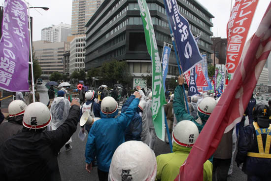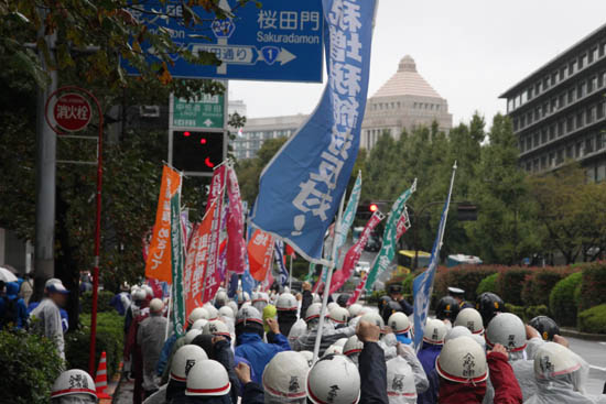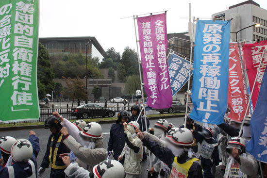 | 「安保粉砕! 改憲阻止!」「安倍ネオ・ファシスト政権打倒!」――10月20日、たたかう労働者・学生は降りしきる雨をついて、国会・首相官邸・アメリカ大使館を揺るがす戦闘的デモンストレーションに決起した。北海道、東海、関西、九州、沖縄においても、この日たたかう労学の白ヘル部隊がデモをうちぬいた。全国6カ所においていっせいに、「日米新軍事同盟の強化反対」「改憲阻止」「原発再稼働阻止」「消費税増税粉砕」の火柱をぶちあげたのだ。 | ||