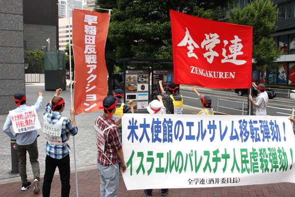 5月18日、全学連のたたかう学生たちは、トランプ政権によるエルサレムへの在イスラエル米大使館の移転とネタニヤフ政権によるパレスチナ人民虐殺を弾劾し、アメリカ大使館・イスラエル大使館にたいする緊急抗議闘争に決起した。