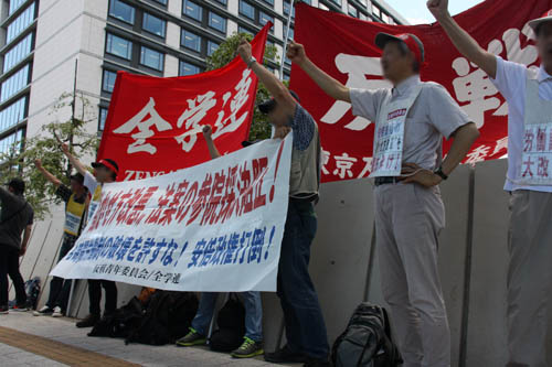 ◆「働き方改革関連法案」の参院強行採決阻止! ◆「高度プロフェッショナル制度」の創設反対! ◆労働法制大改悪反対! ◆8時間労働制の破壊を許すな! ◆法案成立に手を貸す「連合」指導部弾劾! ◆安倍政権打倒! |