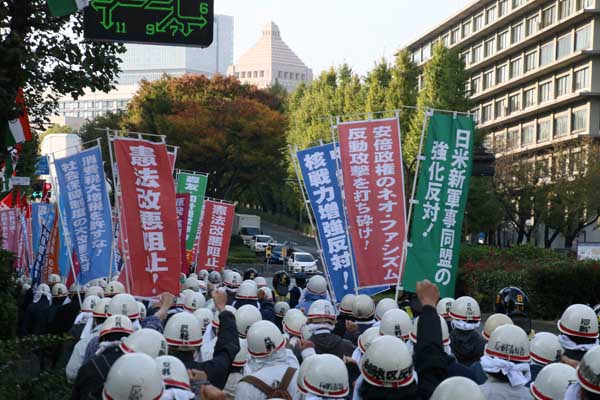 | 10月28日、安倍政権が改憲案提出をもくろむ臨時国会を開会したこの決定的な局面において、全学連は反戦青年委員会のたたかう労働者とともに、憲法改悪を阻止し粉砕するために全国で戦闘的デモンストレーションに断固起ちあがった。関西・九州(10月21日)、沖縄・東海・北海道(10月28日)において、労学統一行動に起ちあがった全国のたたかう労働者・学生と連帯して、首都圏のたたかう労学は、首都中枢に安倍政権による憲法改悪の攻撃を打ち砕くたたかいの炎を燃えあがらせたのだ。 10月24日の臨時国会冒頭、首相・安倍は、「強い日本をつくる」「国の理想を語るものが憲法だ」などとほざいた。南シナ海に日本国軍を送り込み、米軍と一体で対中国の準臨戦態勢をとっている安倍政権。この輩は、アメリカとともに「戦争する国」への飛躍をかけて憲法改悪と日米核軍事同盟の強化に突き進んでいる。 この安倍ネオ・ファシスト政権による戦後史を画する一大反動攻撃を打ち砕け! 全学連と反戦青年委は、「反安保」を放棄した日共系反対運動をのりこえ、日本労働者階級・人民の最先頭で「憲法改悪絶対阻止」の闘いの号砲をぶちあげたのだ。 11月1日には、政府・防衛省が辺野古への土砂投入に向けた工事再開を強行した。沖縄県学連と県反戦労働者委員会は、ただちに弾劾の闘いに決起している。この沖縄の労学と連帯して、首都圏のたたかう労学は、「辺野古への土砂投入阻止」の鬨の声をもとどろかせた。米−中・露激突下で高まる戦争的危機を断固として突き破るという決意に燃えて、首都中枢に反改憲・反戦反安保の火柱を赤々と燃えあがらせたのである。 |