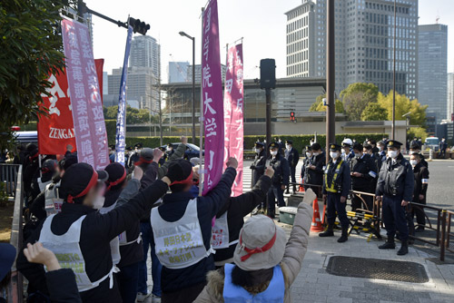 | 1月13日、全学連は、首相岸田が訪米し米大統領バイデンとの首脳会談に臨もうとしていたその時、「日米首脳会談反対」を掲げ首相官邸にたいする闘争に決起した。 首相岸田は、先制攻撃体制構築・軍事費倍増を謳う「安保三文書」の策定を手土産にして訪米し、アメリカ大統領バイデンはこの岸田の肩を抱き寄せ「日米同盟の現代化」を誓わせたのであった。まさにこの首脳会談こそは、ロシアのウクライナ侵略によって〈米中新冷戦〉構造のもとにはらまれていた戦争的危機が一挙に高まる「戦争と大軍拡の時代」への突入という現代世界の激動の真っただ中で、日米軍事同盟を文字通りの対中国攻守同盟へと飛躍させることを宣言する儀式にほかならない。 全学連は、このことを断固暴き出し、「日米軍事同盟の対中・対露攻守同盟としての強化粉砕!」の旗高くたたかいぬいた。岸田政権がこの首脳会談を区切りにして、憲法改悪と大軍拡に突進することを断じて許さず、闘う労働者と連帯して、改憲阻止・反戦反安保の巨大な闘いを創造するという決意に燃えて、断固として奮闘したのだ。 |