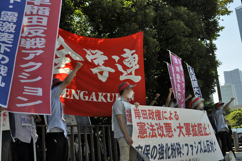 | 9月13日、首相・岸田が第二次再改造内閣を発足させようとしていたこの日、全学連のたたかう学生は、岸田政権がふりおろす憲法改悪・大軍拡をはじめとする反動攻撃を断固として打ち砕く決意に燃えて、対首相官邸闘争に起ちあがった。 首相・岸田は、新たな防衛相に、「安保三文書」にかんする与党実務者協議の主要メンバーとして軍事費倍増や殺傷兵器の海外輸出の推進などの旗振り役であった木原を、財務相には通常国会で「防衛力強化資金」を創設する軍拡財源法の制定をおしすすめた鈴木をすえるなど、再改造内閣の陣容を軍事タカ派の連中で固めた。この新たな布陣のもとに岸田は、8兆円を超える莫大な軍事費(24年度)を投じての大軍拡に、そして臨時国会において改憲条文案の策定に全体重をかけて突きすすもうとしているのだ。対中国・対北朝鮮の核軍事包囲網を構築せんとするバイデン政権の要求に応えて、アメリカ主導の多国間軍事同盟を担う軍事強国へと日本国家を飛躍させるために、先制攻撃体制の構築と憲法大改悪というウルトラ反動攻撃を一挙にふりおろしているのが岸田政権なのだ。 この重大な局面で、「連合」指導部は軍事費倍増などの岸田政権の戦争政策を公然と支持し、傘下の労組から「改憲・大軍拡反対」の声があがることを上から抑圧している。日共の志位指導部は、――安保・自衛隊問題やウクライナ問題をめぐる党内対立の深刻化のゆえに――いっさいの大衆運動から逃げまわっている有様なのだ。 この「連合」指導部や日共中央の犯罪的対応を満腔の怒りを込めて弾劾し・既成反対運動の総死滅状況を断固としてのりこえるかたちで、全学連は首相官邸前において、「改憲・大軍拡阻止! 日米グローバル同盟の強化粉砕!」の闘いの炎を燃えあがらせたのだ。 |